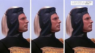 Ambassador Fox has an assistant we only see when he beams down and is taken hostage. This Tony Perkins look-a-like never says anything. And he has the worst death I've seen in quite some time. After being rescued by Spock, Fox and Tony are walking behind the Vulcan when they encounter some Eminian guards and they all exchange "sonic disruptor fire" and Tony sort of squats in a corner and dies. He squats and he dies. Is there a sillier death than that?